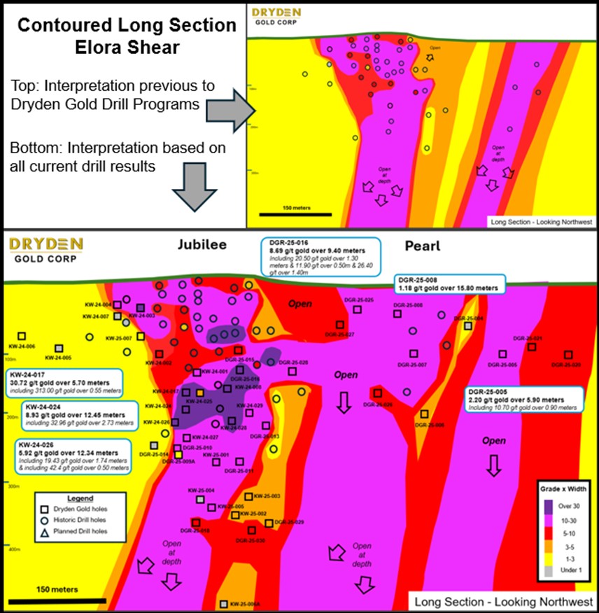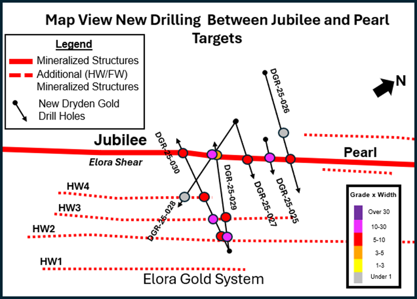 Vancouver, British Columbia — November 12, 2025 — Dryden Gold Corp. [TSXV: DRY, OTCQB: DRYGF, FSE: X7W] (“Dryden Gold” or the “Company”) reports the final results from its 2025 drill program along the rapidly expanding, open-ended, high grade Elora Gold System. During 2025, the Company has more than tripled the size of the principal structure, the Elora Shear zone, to over 800 metres along strike. The most recent results show good continuity between the historic Jubilee and Pearl occurrences (Figure 1). The Elora Gold System remains open at depth, with the vast majority of drill holes still above the 200-meter vertical level. In addition, the 2025 program discovered, and begun to outline, several sub-parallel, gold bearing structures in the hanging wall (“HW”) to the Elora Shear (Figure 2). In near-surface drilling, holes DGR-25-029 and DGR-25-030A returned the widest intervals to date on both the HW2 and HW3 structures while drill hole DGR-25-028 intercepted the widest interval to date on the Elora Shear (Table 1). See video here.