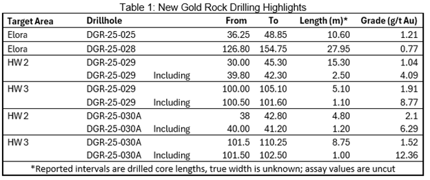 Trey Wasser, CEO of Dryden Gold states, “The most important of our four goals for the 2025 exploration program was to expand the size of the Elora Gold System. From this spring’s high-grade discovery at Pearl, to the discovery of high-grade gold mineralization in the new Hanging Wall structures and with the continuity of the main Elora Shear Zone now being demonstrated, we are in a great position as we lay out our 2026 drill program at Gold Rock. Figure 1 clearly demonstrates this significant progress and outlines a continuous zone of gold mineralization for over 600 metres which remains open for expansion. Combined with the promising early-stage discoveries at Sherridon & Hyndman, we have now delivered on three of our four 2025 goals. We have recently completed initial drill testing of our Mug Lake target (assays pending) with the objective of outlining the broader potential of the greater Gold Rock Camp, which was our fourth goal for 2025.