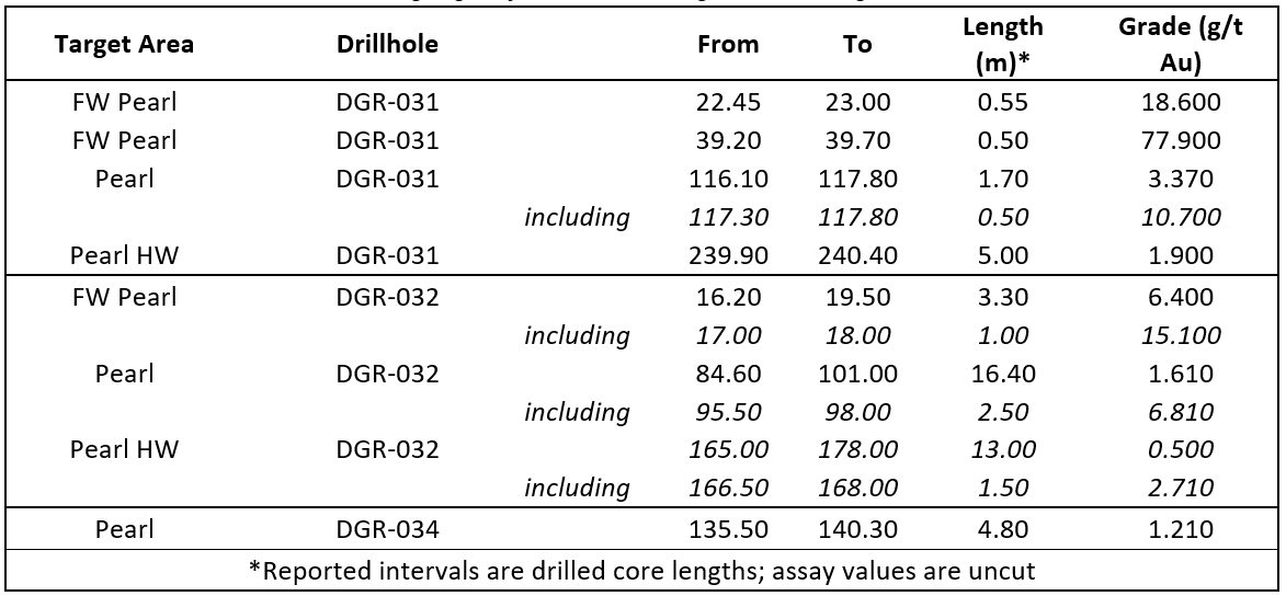 - Hole DGR-032 returned 6.4 g/t gold over 3.30 meters including 15.10 g/t gold over 1.00 meters in new high-grade footwall zone at Pearl