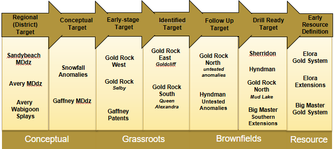 Dryden Gold possesses the most extensive land package in the area, comprising numerous distinct targets from conceptual to brownfields. The properties and targets in the pipeline below are consistently being re-evaluated as new technical and field work data becomes available.